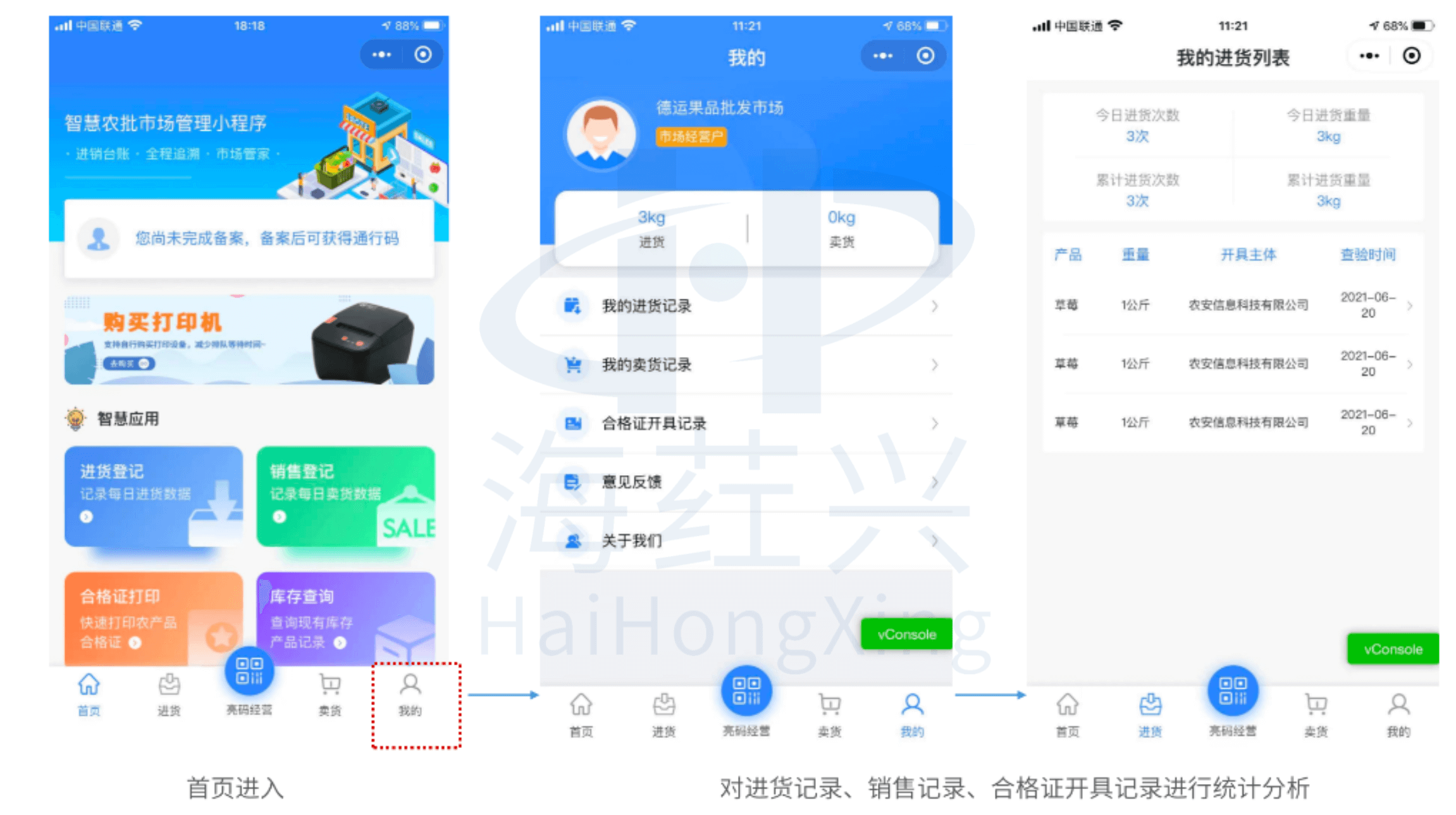 农产品批发市场经营者可在微信小程序中实时掌握进货记录、销售记录及食用农产品合格证开具记录,并查询在销农产品的