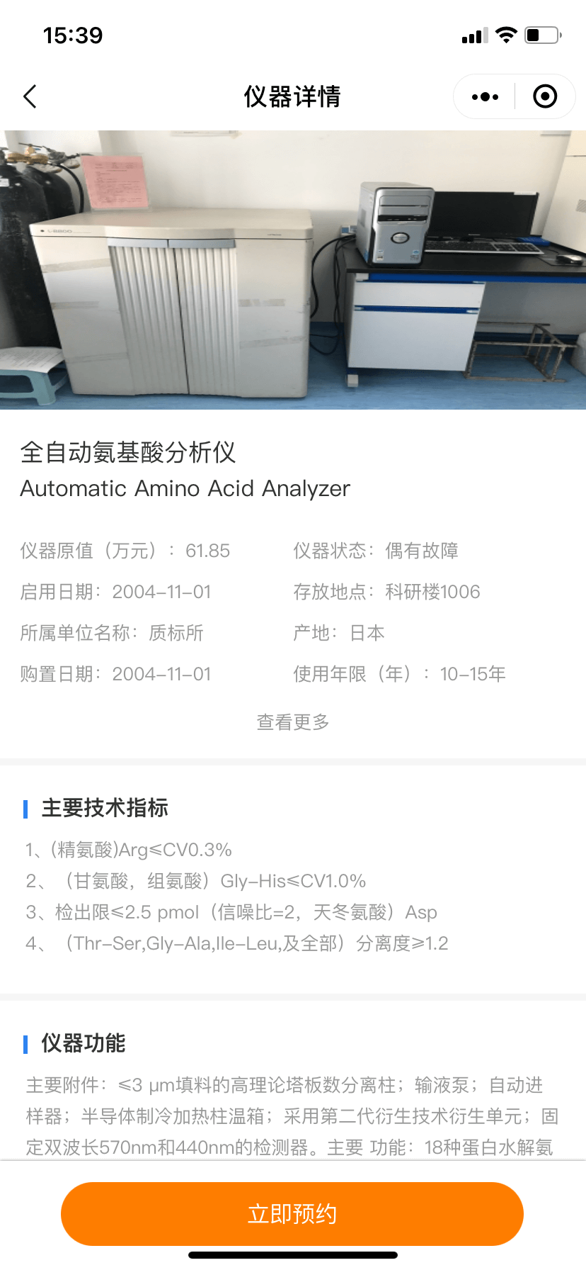 在微信小程序查看仪器设备的各项信息,选择设备使用预约时间。
