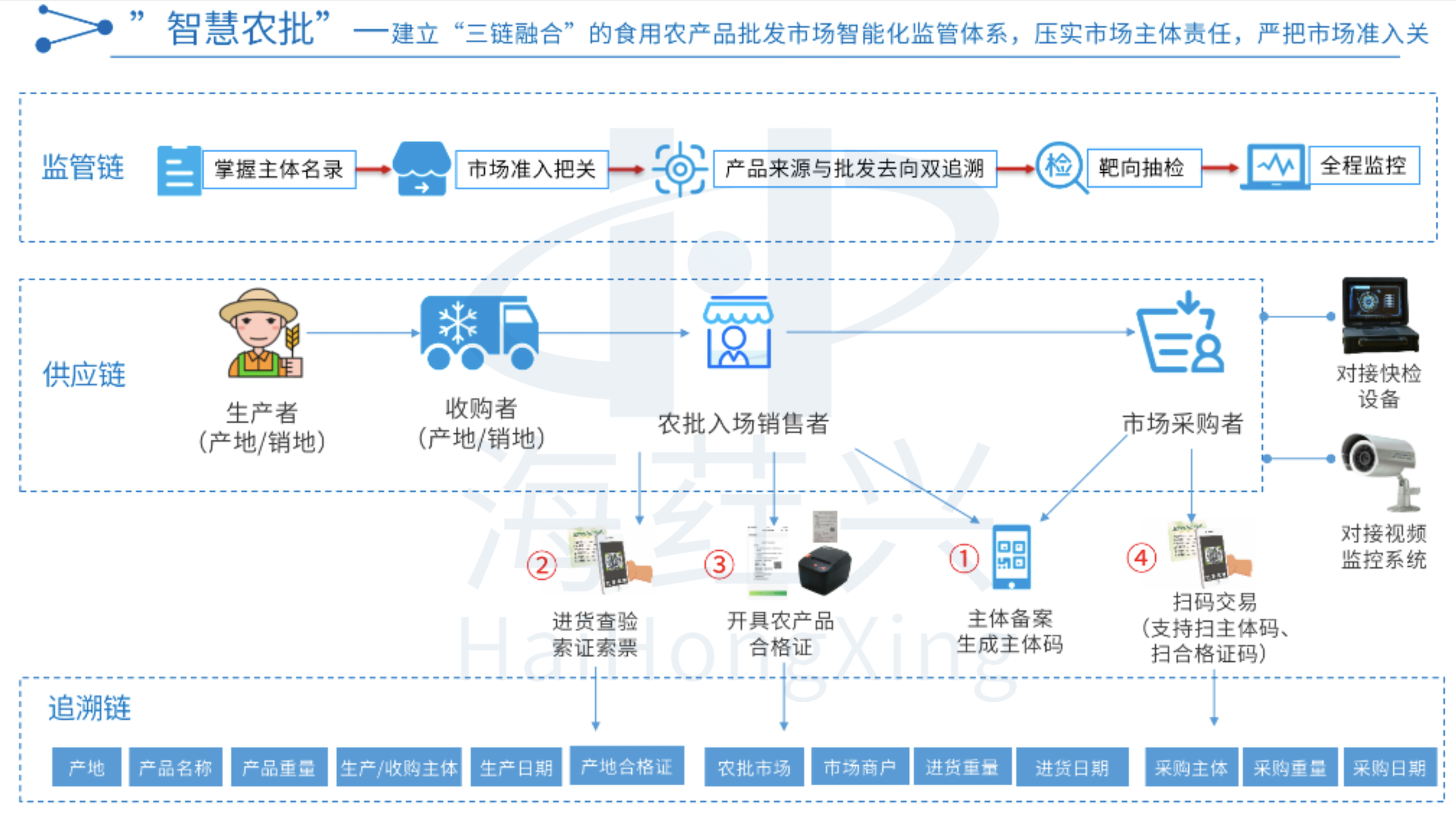 农安信.智慧农批”平台依托移动端和PC端应用,满足主体备案(市场开办者、经营者、采购者)、进货查验、索证索票、质量安全合格证明开具和扫码交易等功能,建立电子化的购货凭证和进出货台账,打造“供应链”(生产到批发)、“追溯链”(产品来源和批发去向双追溯)、“监管链”(台账制度、精准溯源、靶向抽检)“三链”融合的食用农产品批发市场智能化监管体系,进一步压实主体责任,严把市场准入关,强化食品安全监管。