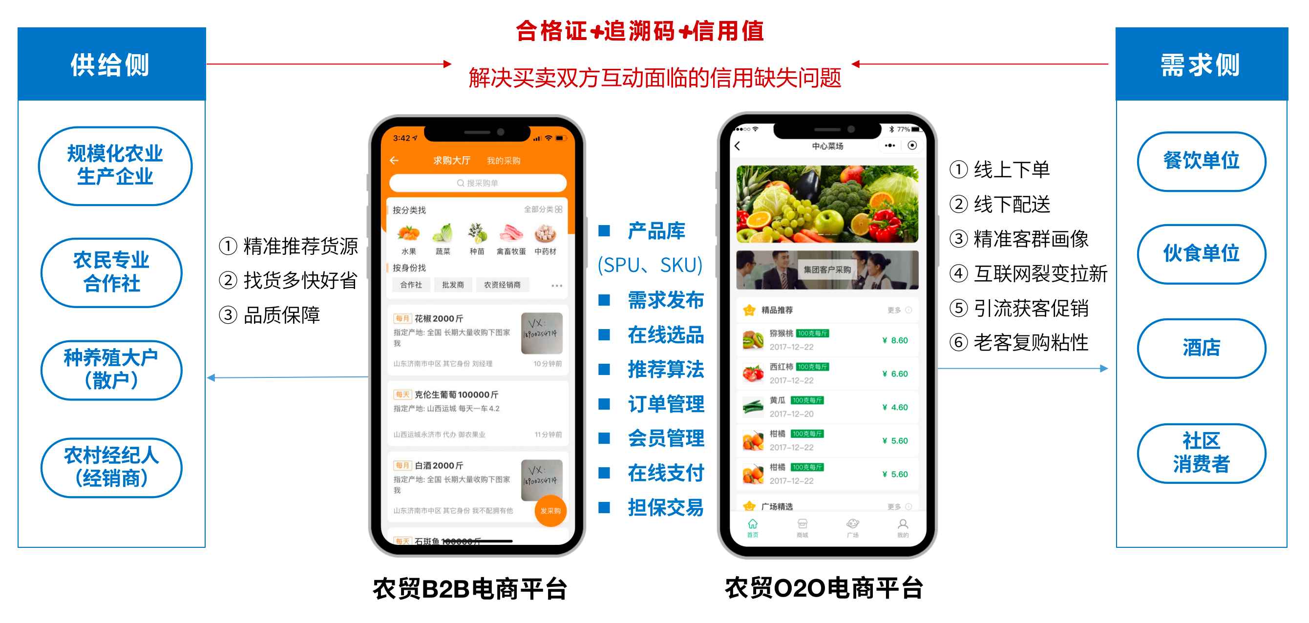 以农贸市场为轴心,打造农贸O2O电商平台和农贸B2B电商平台,建立“点、线、面、体”式的互动应用和协同网络,打通农产品供应的价值链、信息链和生态链,通过品质保障、产品溯源和信用体系,解决买卖双方互动面临的信用缺失问题。