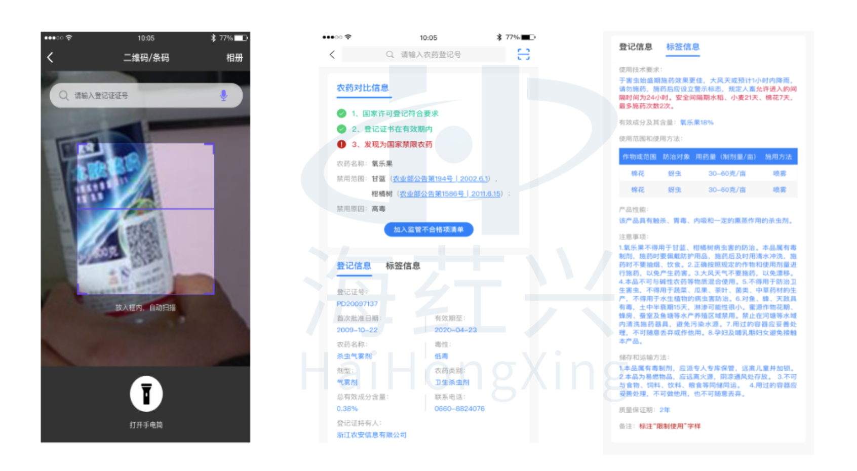 农户在自购农药时,可使用移动端应用扫码识别农药包装二维码或输入农药登记证号,系统自动核对农药信息,对于违规农药、过期农药、高毒高残留农药、禁限用农药等进行预警提示,并完整显示农药产品登记信息和标签信息,帮助农户从源头严防严控农产品质量安全风险。