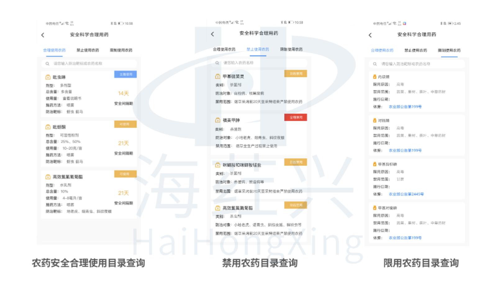 将农药安全合理使用清单、禁用农药清单、限用农药清单等制作成结构化的农药目录数据库,在移动端应用中予以列表展示和标签注释,标注每种农药的剂型规格、含量、使用量、施用方法、防治靶标和安全间隔期要求等,方便农户以病虫害或农药名称作为关键字,检索农药目录信息,安全科学合理使用农药,同时也指导生产者采购生物农药或低残农药,杜绝高毒高残留农药出现在农户农药使用名单里。