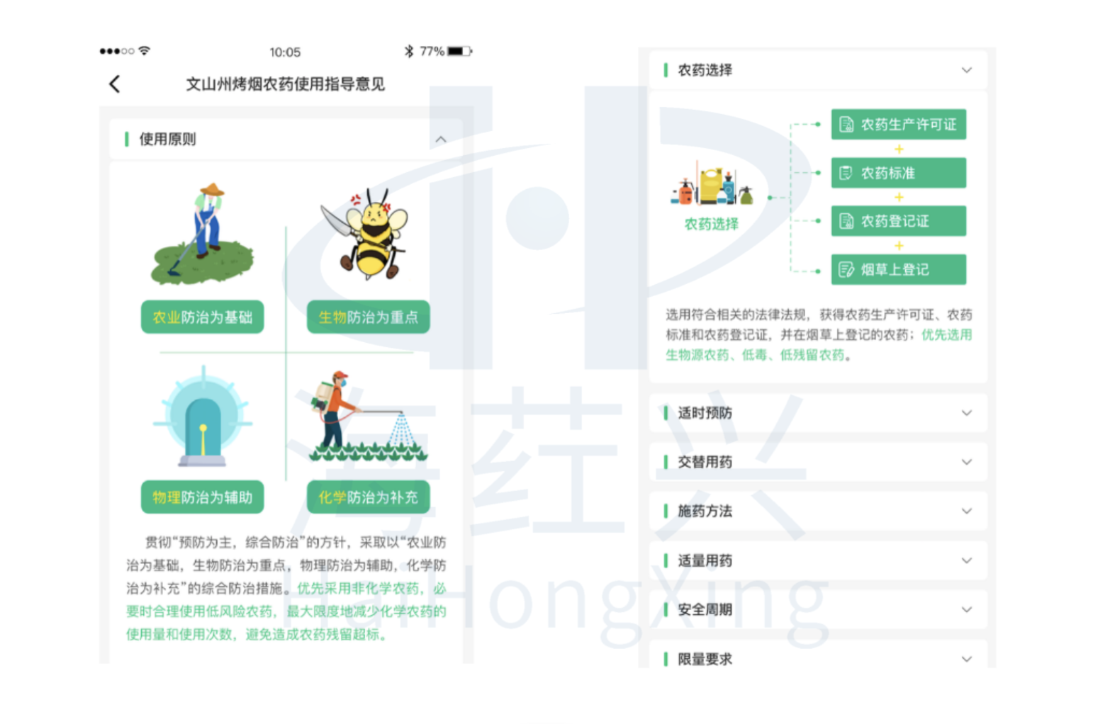 以卡通图文的形式,形象化、场景化的向农户展示农药使用规则、农药选择方法、适时预防措施、交替用药建议、施药方法、安全间隔期规定和限量要求等,倡导绿色防控示范模式,并在移动端应用中提供《GB/T 8321(农药合理使用准则)》和《GB 12475(农药贮运、销售和使用的防毒规程)》的内容全文检索功能。直观和形象的引导农户对症、适时、适量、正确施药,做到安全周期用药,确保农产品质量安全。