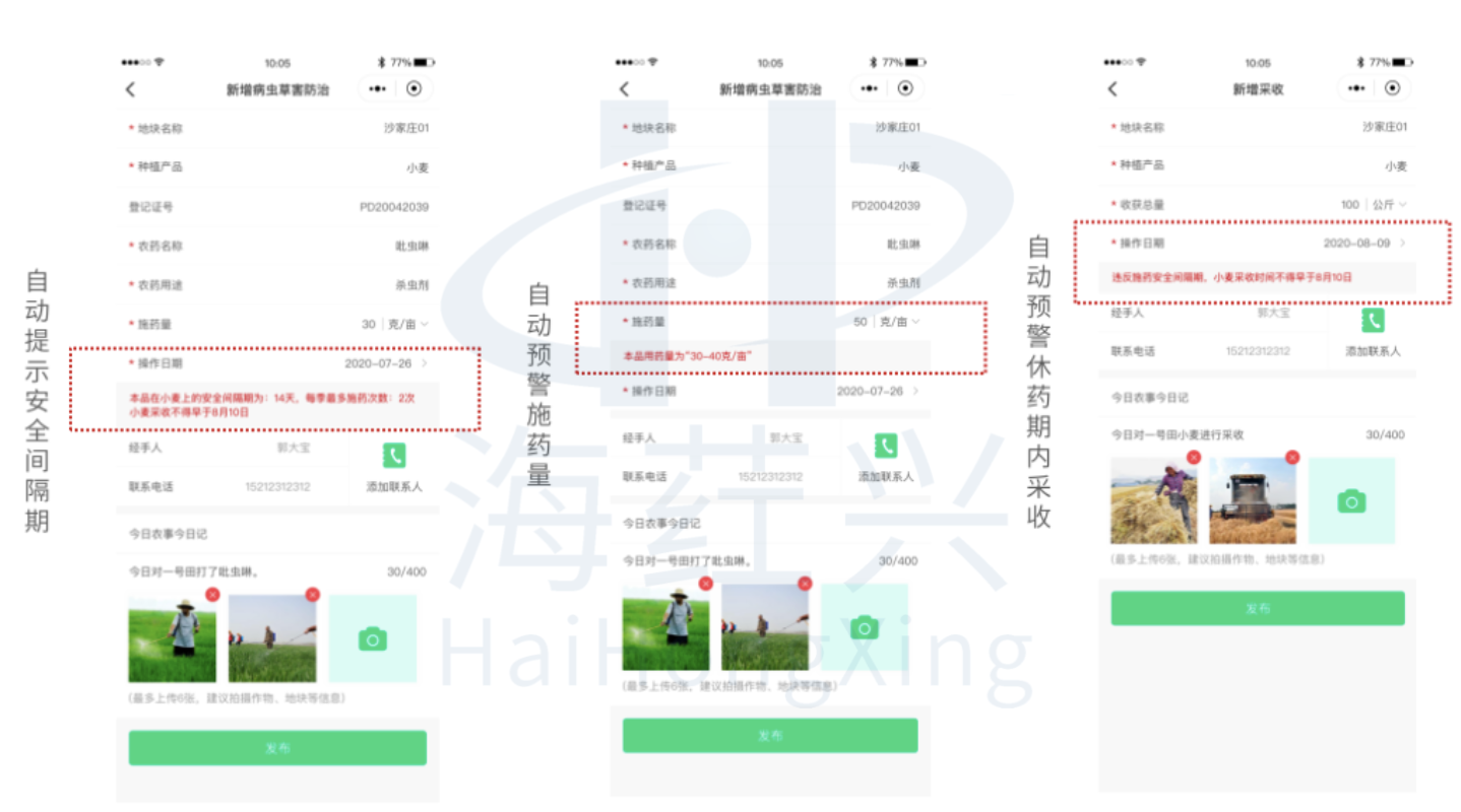 “农安信.企业版”移动端应用在施肥、用药、采收等各关键环节,对农户录入的信息进行自动提示预警,引导其保障农产品质量安全,提质增收。例如,依据用药产品,预警禁用或限用农药;依据用药时间和采收时间,预警农药安全间隔期,指导降低农残的最佳采收时机等。