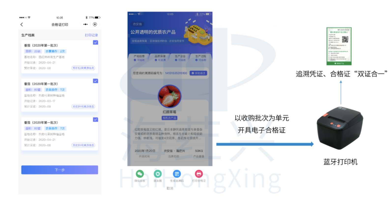 农业生产者以农产品包装或车辆或收购批次为单元,利用移动端应用和蓝牙打印机开具连接种植过程、检测记录、物联网监测信息(包括:田间摄像头、小型农业气象站、土壤墒情传感器等)、品牌宣传信息于一体的食用农产品合格证,满足产地准出凭证、政府监管追溯和消费者扫码查询需求,让好产品在同质化的竞争中凸显差异化和品牌化,提升市场竞争力。