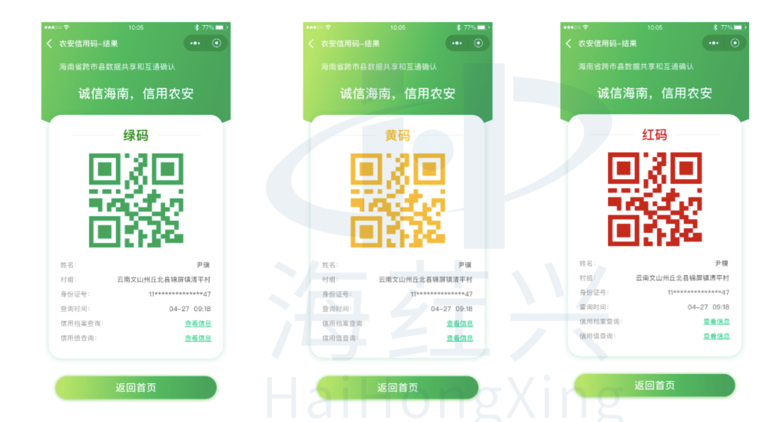 从全国农产品质量安全信用服务平台中获取农业生产者的信用评价结果,在移动端动态生成代表当前主体信用状态的绿码、黄码、红码,并与主体信用档案关联显示。