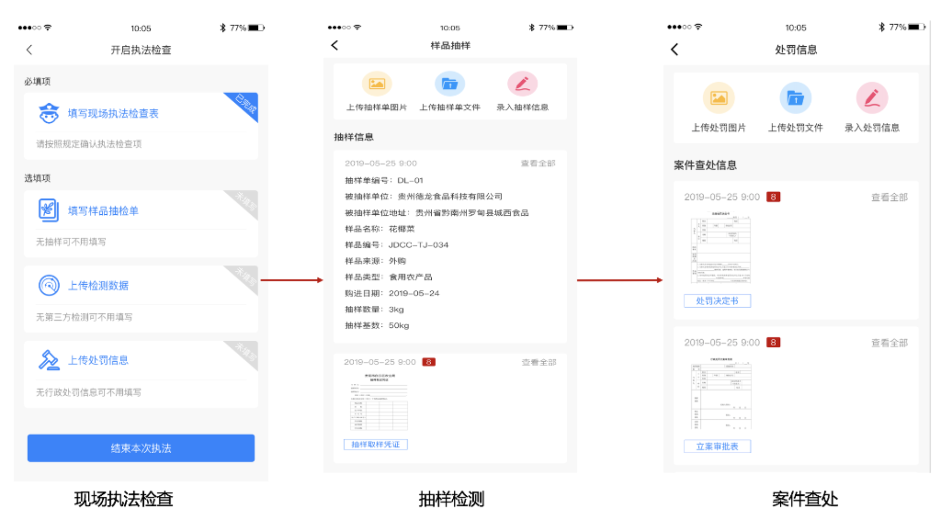 在移动客户端进行执法线索管理、现场执法检查、智能采样和案件登记。