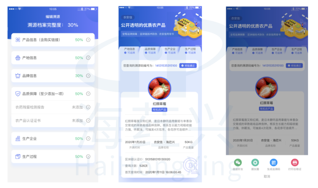 在品控方面,方便基地农户对农产品种养殖过程进行精细化、智能化和可视化管理,对生长周期内的病害和施药情况提供在线全程“顾问式”服务。在品牌方面,以溯源、在线微店等为切入点,逐步构建溯源带货、电商带货、直播带货的多元化推广渠道。