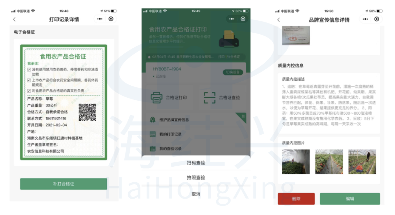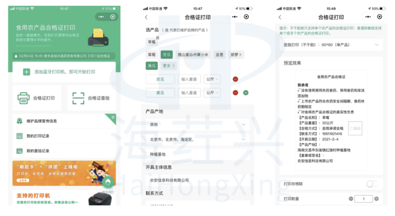 面向有检测能力的农产品生产者或将检测合格作为产地准出必要条件的地区,提供合格证智能机产品,实现自检合格与合格证开具一体化,增加合格证的可信度,让合格证产品更加符合收购标准和入市条件。面向其他生产者,提供“微信小程序+蓝牙打印机”、手持智能机、APP解决方案,满足便捷开证和品牌宣传的双重需求。