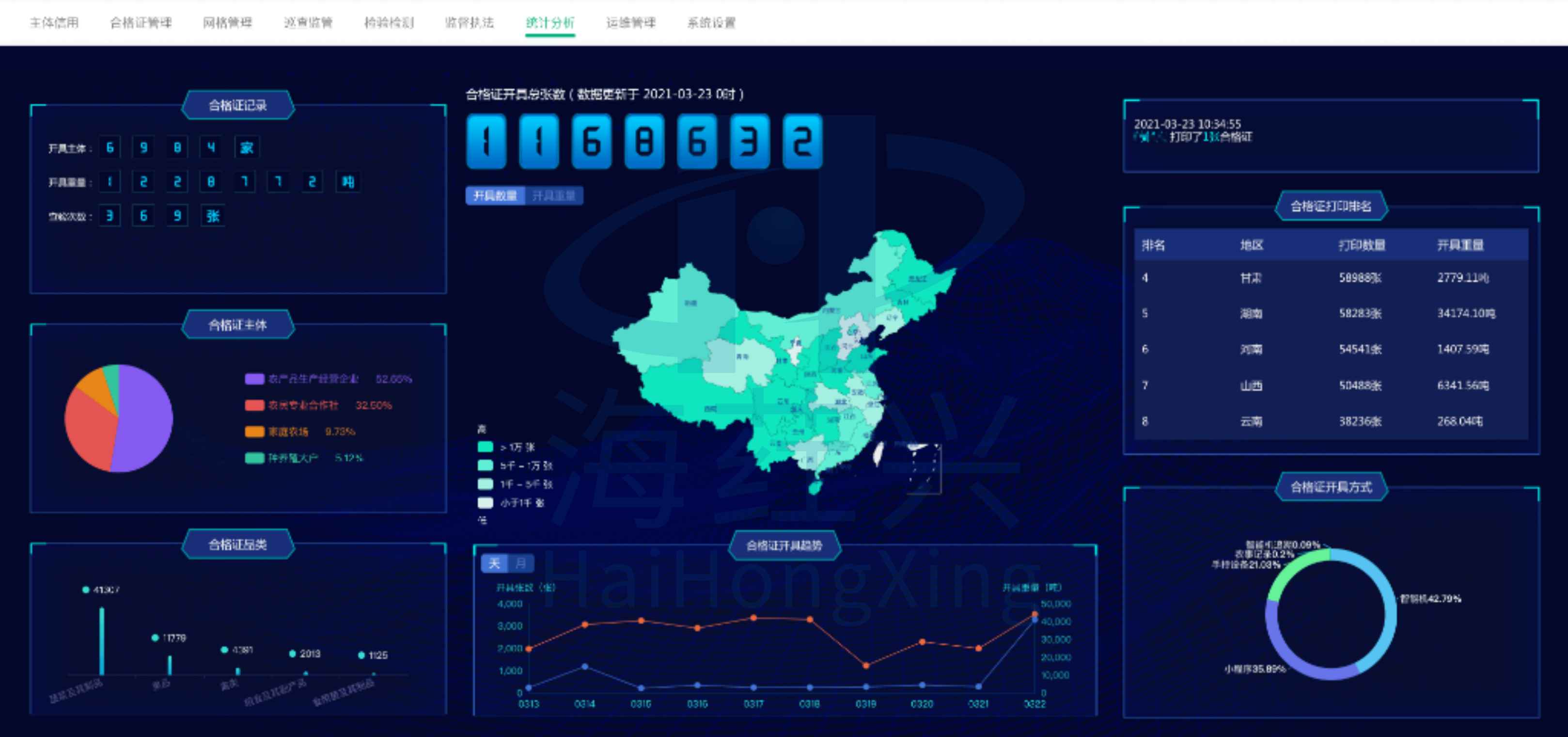 按合格证试行区域、试行主体、试行品类等进行数据分类统计,生成可视化一张图。