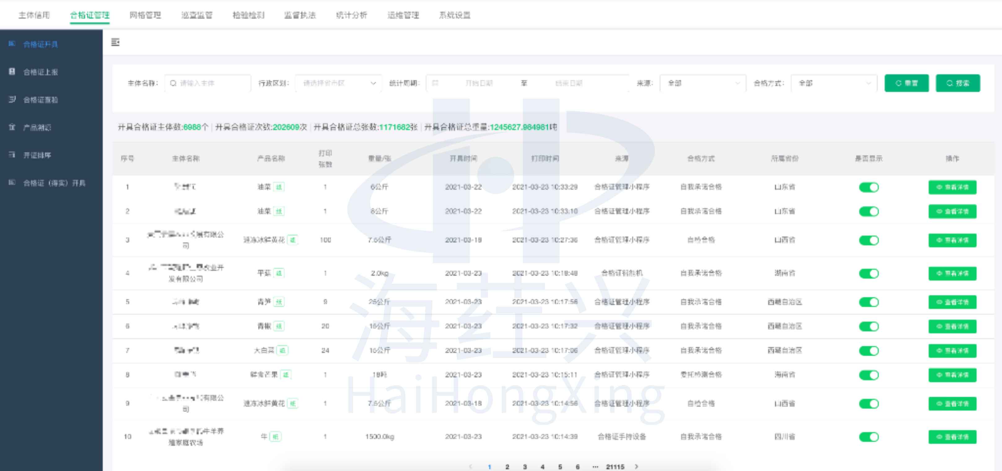 对区域内合格证开具记录进行动态查询,对于附加农产品生产过程溯源信息、检测合格信息的合格证,在合格证开具记录的详情界面予以关联展示。