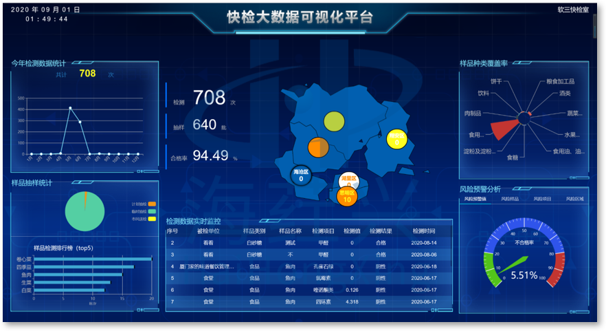 可视化展示抽检覆盖率、抽检比例、检测批次、合格率等指标,以及检测数据的实时滚动。对高风险样本、农残项目、种植区域、种植户进行预警提醒。内置不合格结果的复检流程。