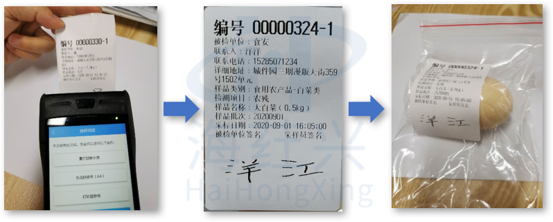 手持智能采样仪在信息录入完毕后可直接打印带背胶的采样信息小票,信息小票包含样本编码等样本信息、种植户信息、采样单位信息。封存样本时将信息小票连同封条一起封贴于样本上,随样本一同运输往各检测中心,实现了“一样一单一票一号”的绝对统一。