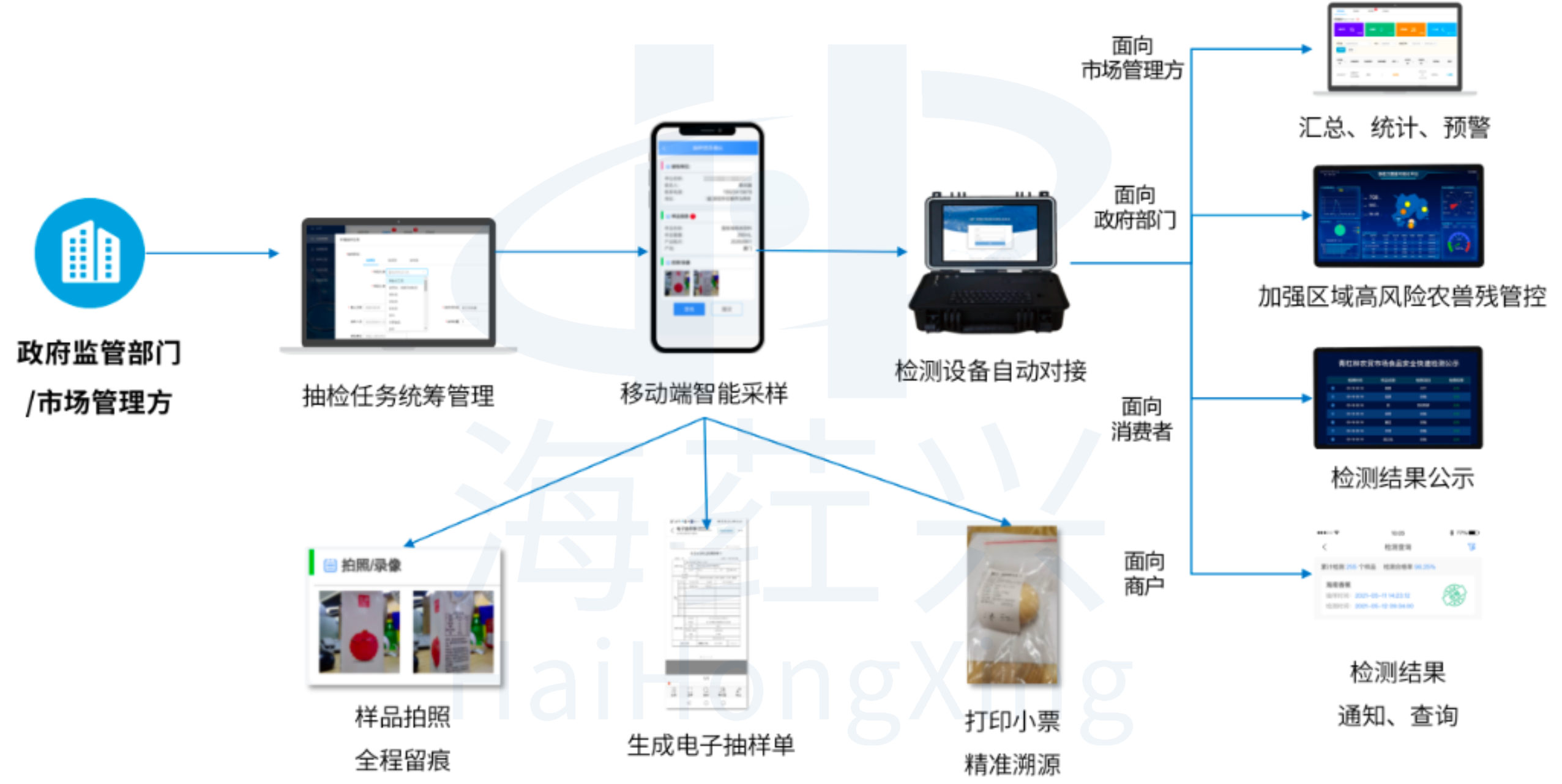 帮助市场经营者建立食品和食用农产品“抽样—>检测—>预警—>研判—>应急”的闭环式数字化检验检测体系,加强检测结果会商分析、情况通报,风险预警能力。