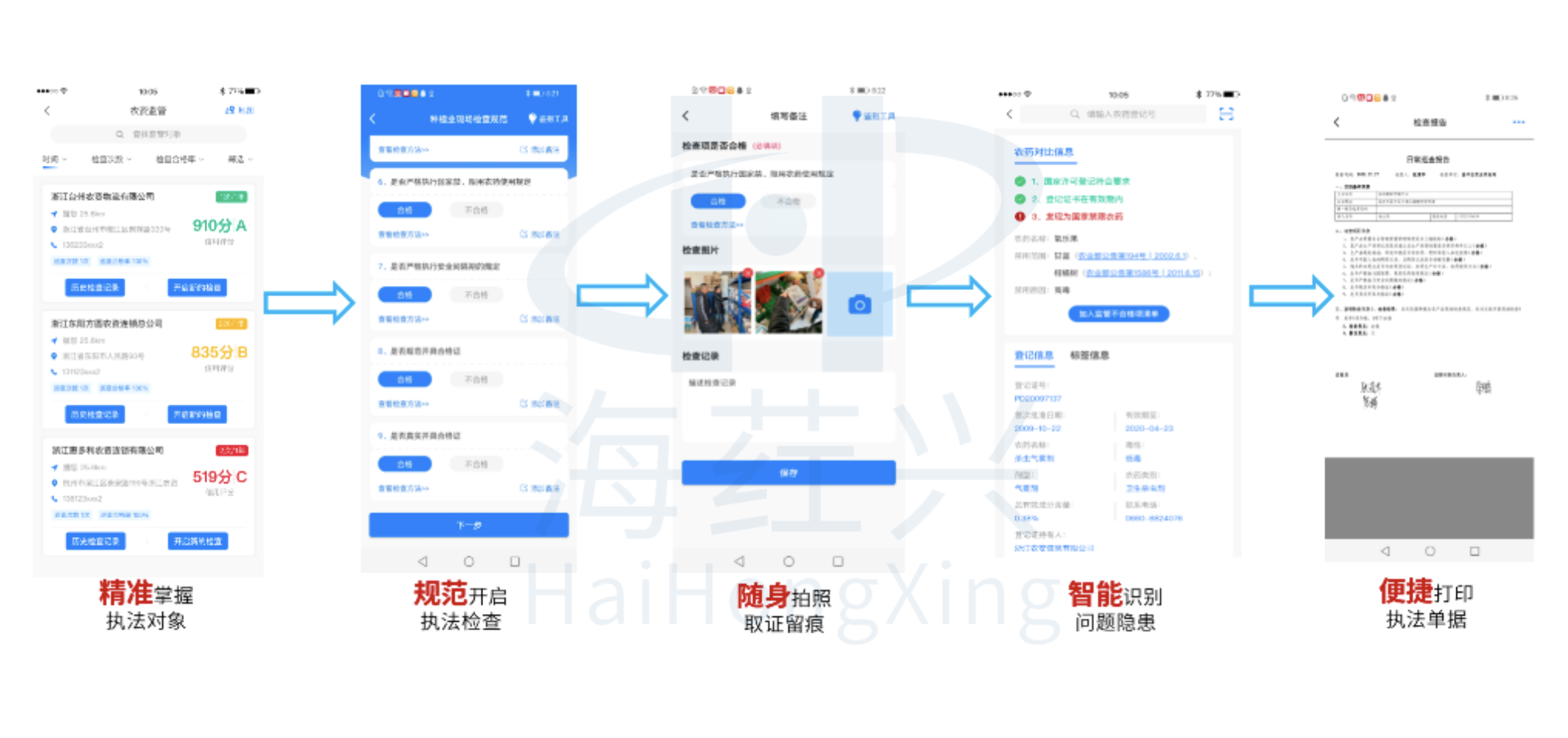 依托移动端应用或移动执法稽查仪,采用“五定”防伪技术(即定时、定位、定人、定事、定景),实现监督执法过程信息的实时采集、快速传递、风险预警,帮助基层执法人员高效完成对农资打假、农产品质量安全执法、秸秆禁烧巡查、安全生产巡查等执法检查工作,从传统“人盯人”模式转变为信息化、实时化、高效化、智能化的执法模式,用先进的技术武装执法人员,强化执法手段,推动治理体系和治理能力现代化建设。最终实现主体名录、巡查监管、检验检测、执法处置等信息管理“一张网”,具体操作“一手握”。