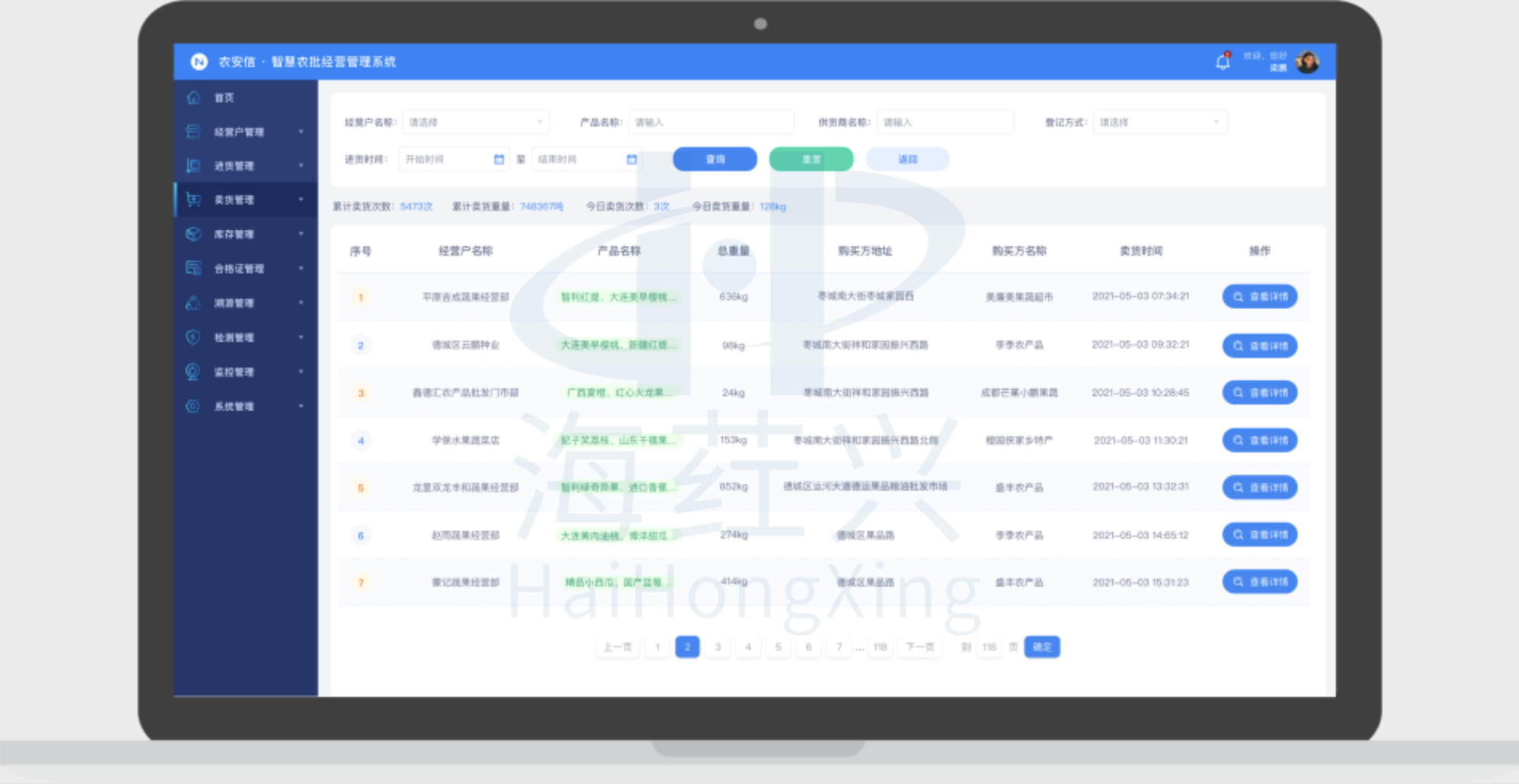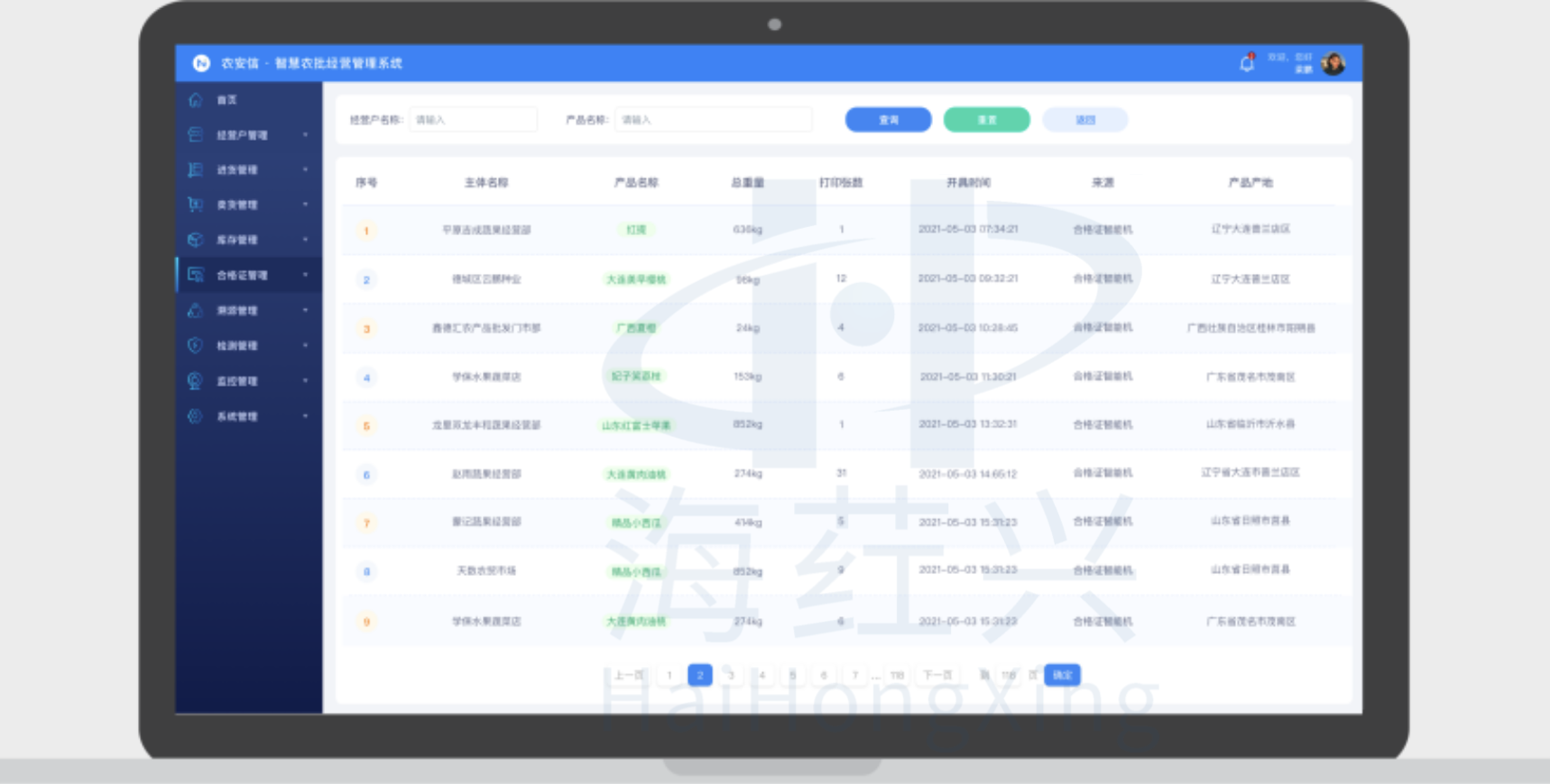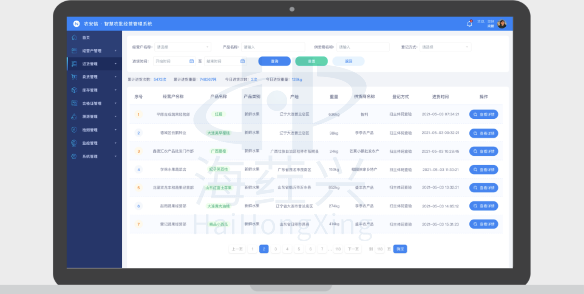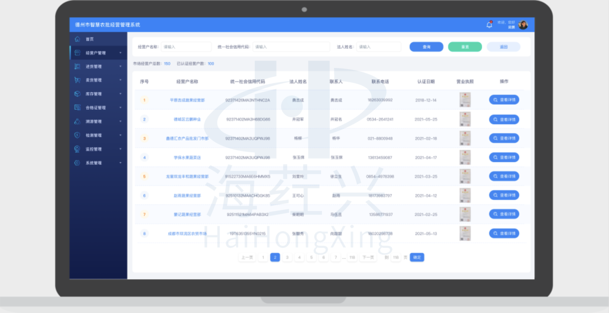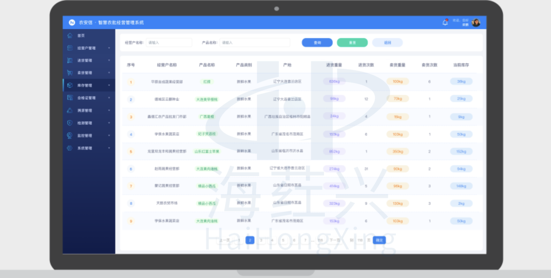 对农产品批发市场经营户、进货台账、购货凭证、食用农产品合格证、销售台账、当前库存等信息进行动态查询和详情概览,实现农批市场信息管理