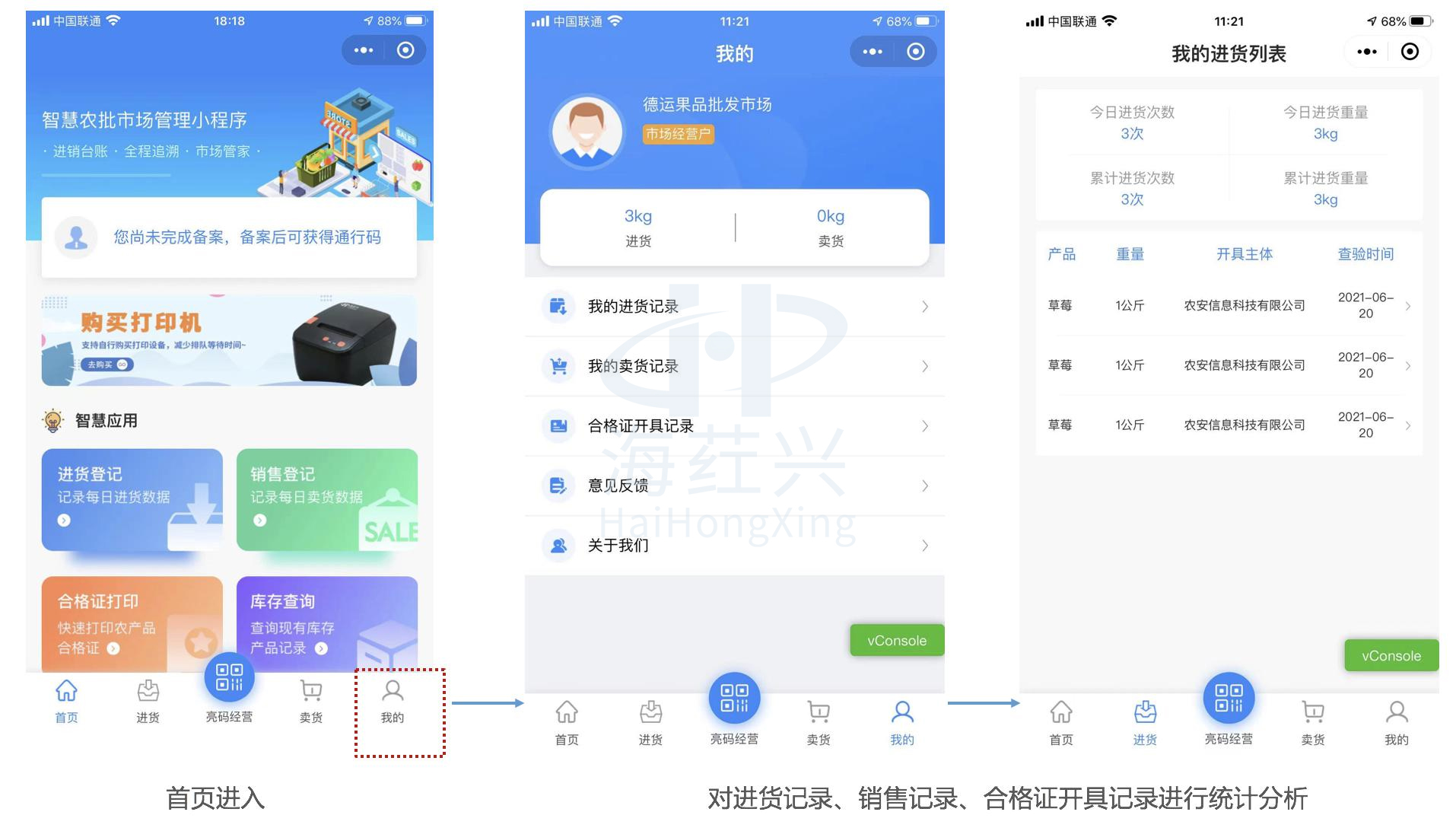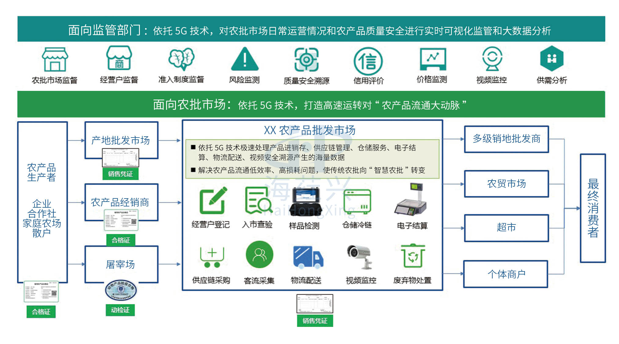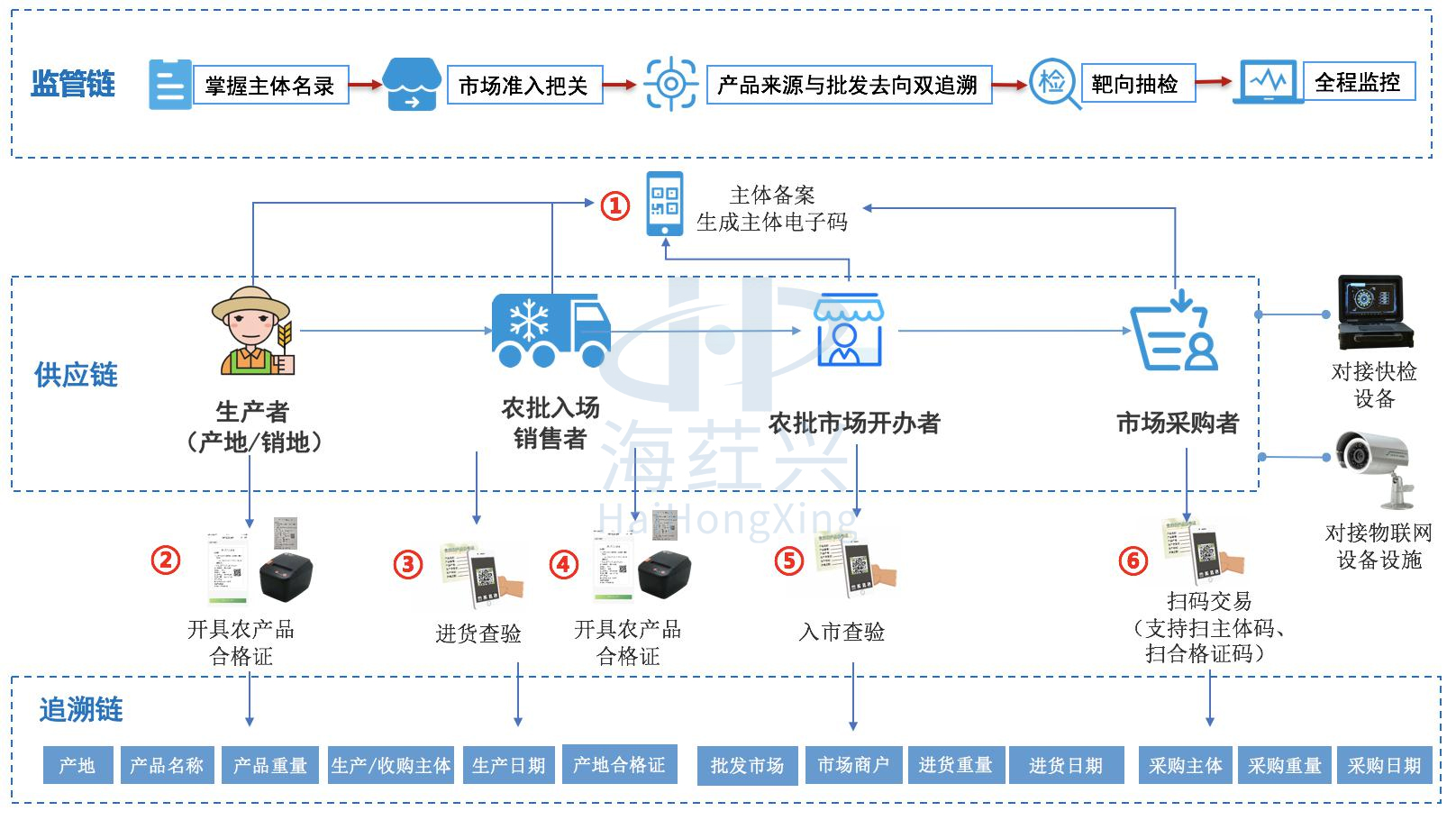 为积极响应《关于加强农产品批发市场监督管理的规定(征求意见稿)》、《食品安全法》、《食用农产品市场销售质量安全管理办法》,海荭兴在总结全国各地食用农产品批发市场监督管理经验做法的基础上,研发了“农安信·智慧农批”软硬一体化平台系统,旨在用好食用农产品达标合格证制度的基础上,实现合格证、追溯凭证、检测证明的“三证”信息融合,形成食用农产品“产地赋码带证上市、市场验码查证准入”的双向追溯机制。