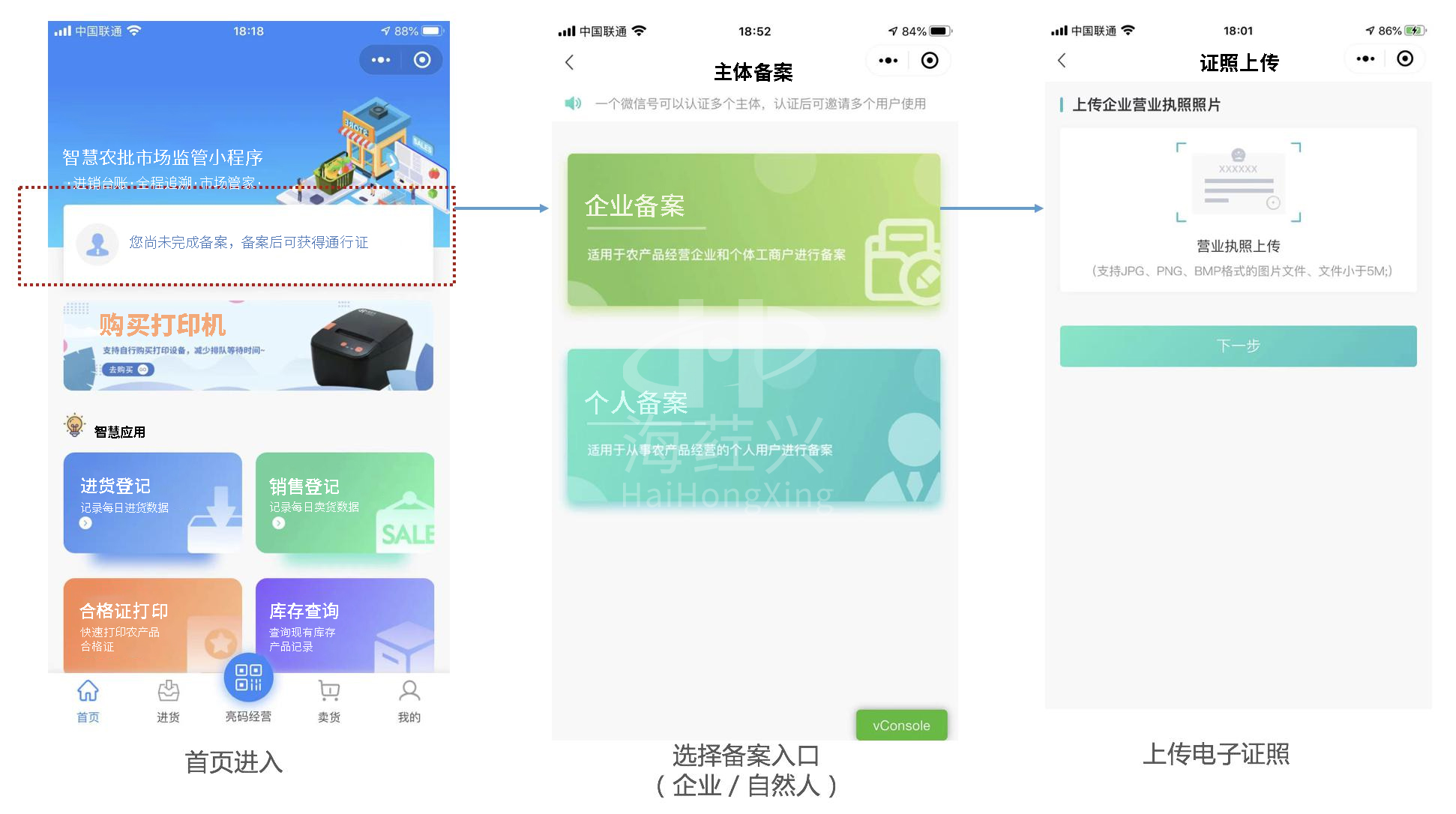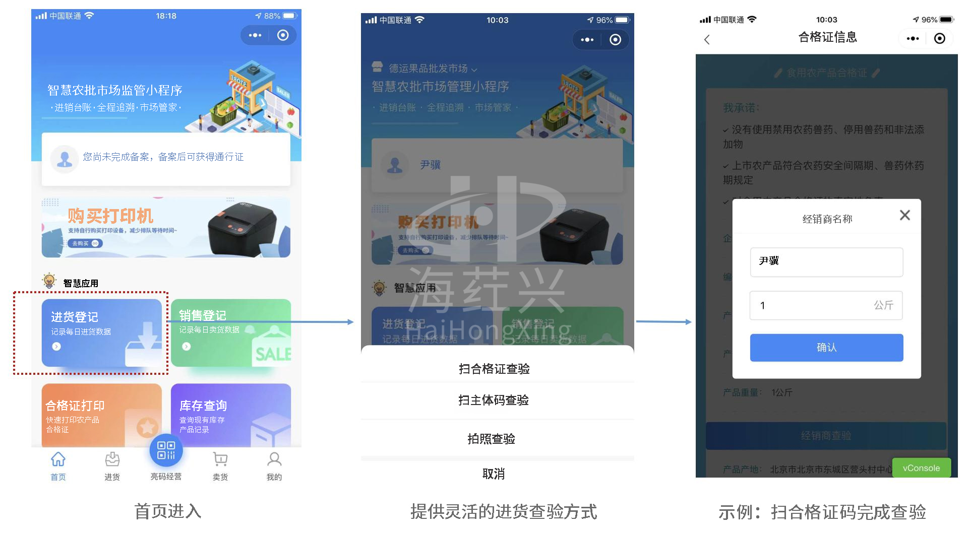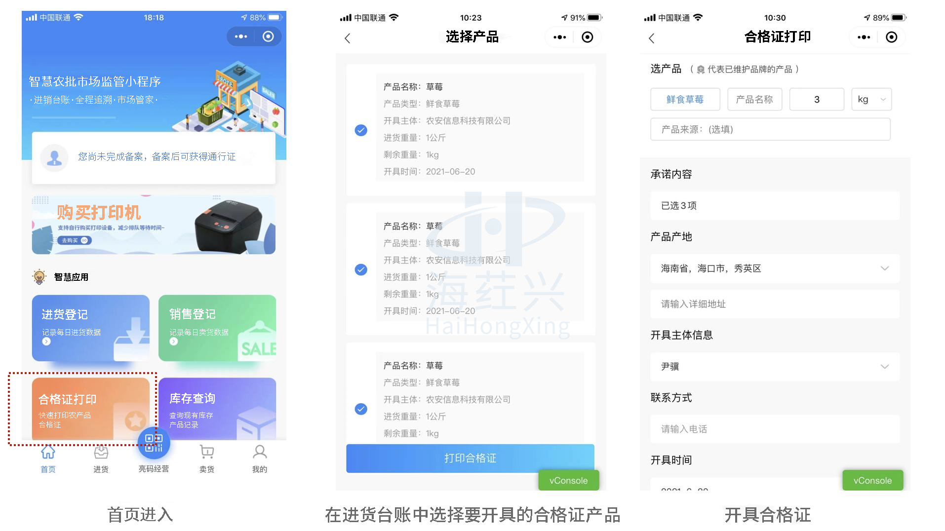 为积极响应《关于加强农产品批发市场监督管理的规定(征求意见稿)》、《食品安全法》、《食用农产品市场销售质量安全管理办法》,海荭兴在总结全国各地食用农产品批发市场监督管理经验做法的基础上,研发了“农安信·智慧农批”软硬一体化平台系统,旨在用好食用农产品达标合格证制度的基础上,实现合格证、追溯凭证、检测证明的“三证”信息融合,形成食用农产品“产地赋码带证上市、市场验码查证准入”的双向追溯机制。