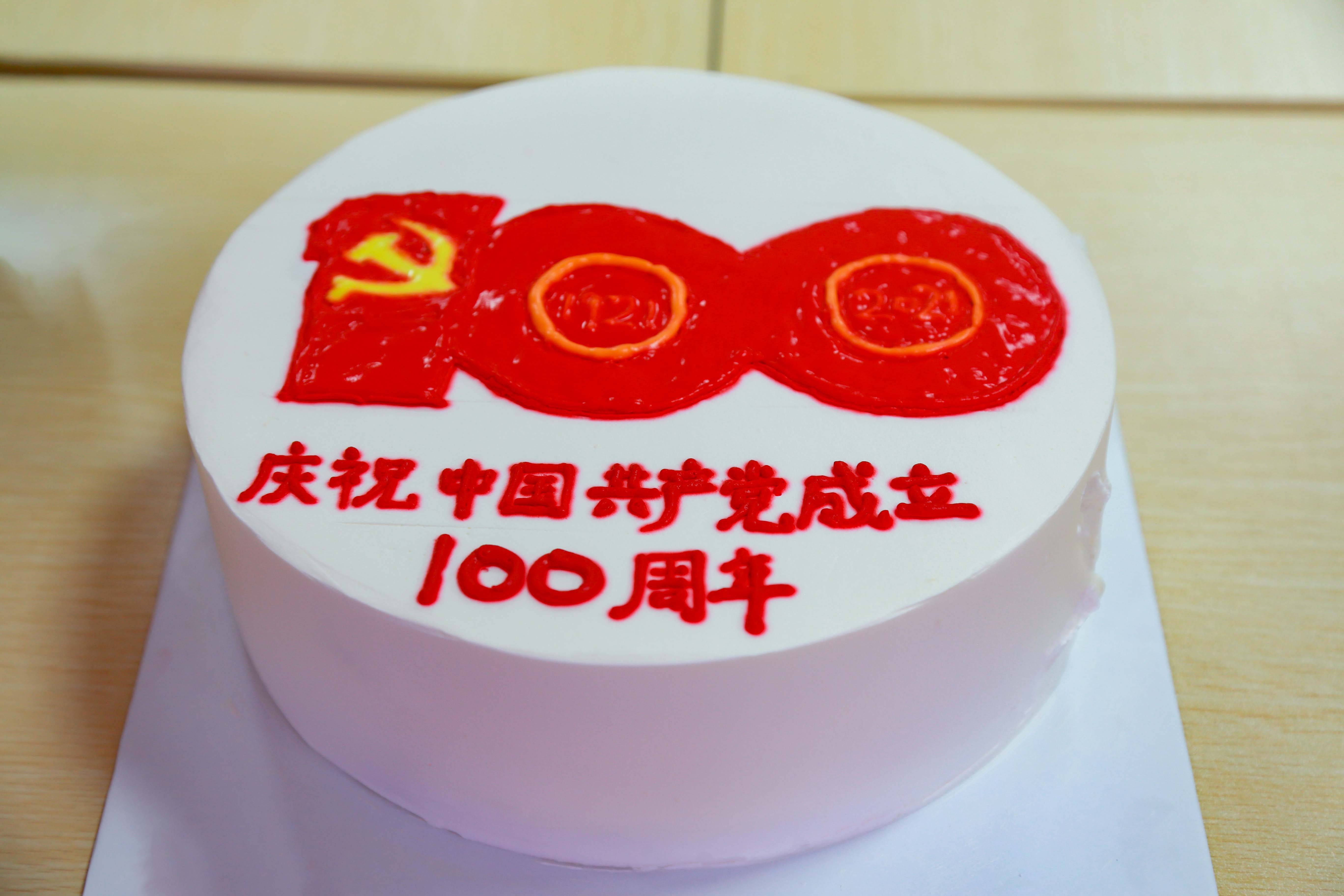 党支部在建党100周年的生日大蛋糕前