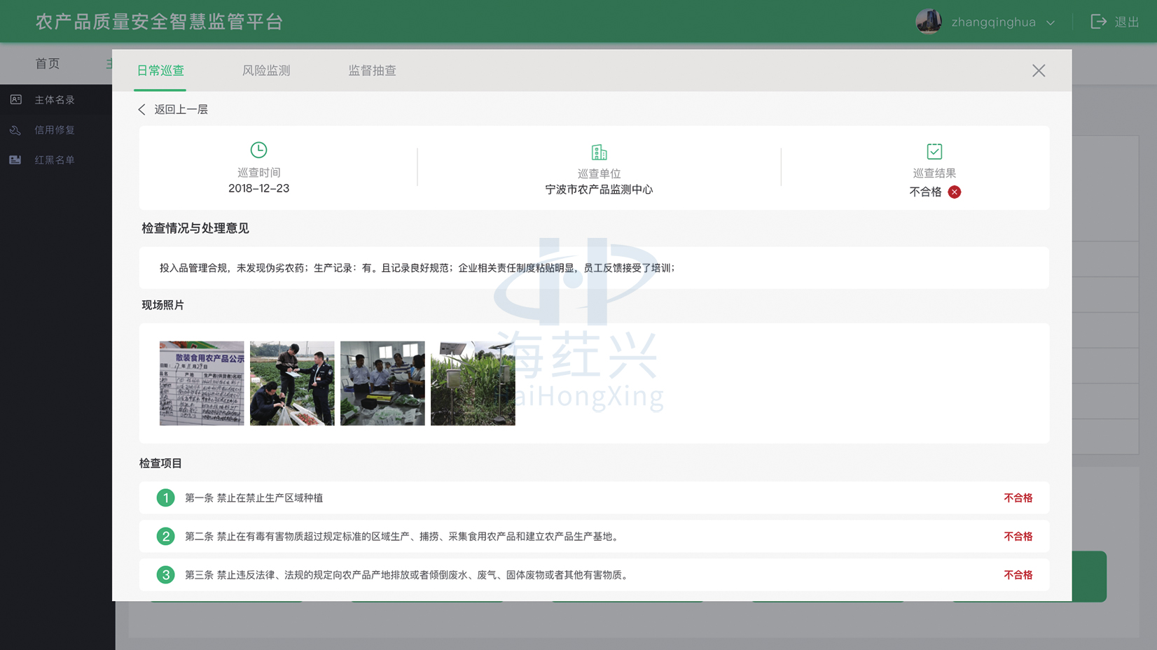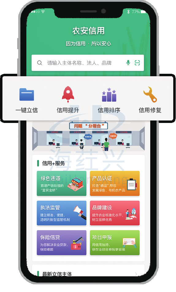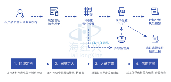厦门海荭兴子公司农安信息科技(北京)有限公司充分发挥技术优势,从整体上提升农产品质量安全监管的数字化、精准化、智能化水平,满足监管、监测、执法、追溯、信用管理、大数据展示分析一体化服务和信息系统实质性整合共享的双重需求。