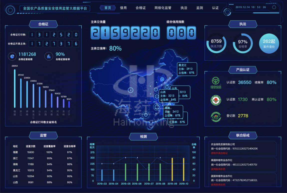 为助力农业农村部有序推进农安信用体系建设工作,提供技术支撑,借助大数据利用信用监管大数据平台,真正做到“底数清、情况明、问题准、措施全”。