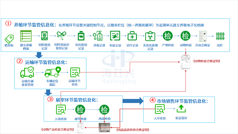 加强生猪和生猪产品全链条监管体系建设。通过“猪耳标、动物检疫合格证、食用农产品合格证、动物产品检疫合格证”批次关联 ,实现对生猪养殖、运输、屠宰、入市全过程的全链条智慧监管。