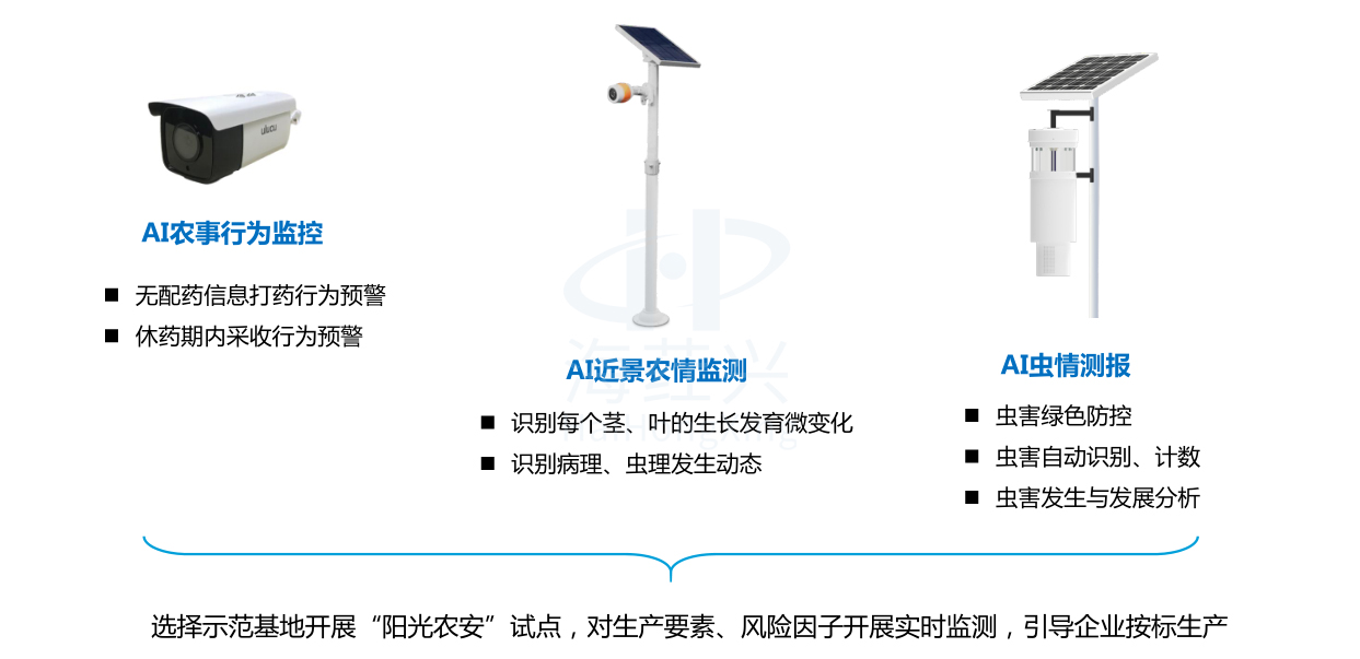 借助农业物联网设备和AI技术应用,实现对农作物生产过程(施药、采收)、生产要素(气象、土壤、虫害)、风险隐患的实时监测、远程监控和自动控制,打造“阳光农安”试点示范应用。
