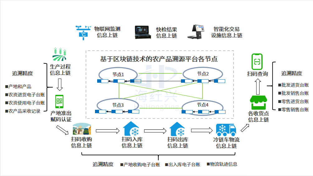 将农产品供应链中的生产过程信息、产地赋码信息、市场查验信息、采购交易信息、日常检验信息、社会监督信息等数据的哈希值和校验地址上至区块链,构成分享隐私存证,通过存证校验实现农产品产地源头和产品流向跟踪的可溯源性、不可篡改性和防伪性。