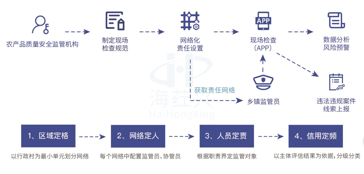 支撑建立“区域定格、网格定人、人员定责、信用定频”的网格化监管体系,通过网格内“人事物”的数据汇聚,建立关联,生成乡镇网格化关系图谱。为基层监管人员提供APP,采用“五定”防伪技术(定时、定位、定人、定事、定景),实现基地巡查、农资监管、检验检测、监督执法等业务工作过程信息的实时采集、隐患排查、留痕取证、快速传递和风险预警。