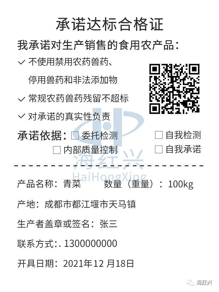 2021年11月3日,农产品质量安全监管司发布的《农业农村部办公厅关于加快推进承诺达标合格证制度试行工作的通知》指明了新版承诺达标合格证的开具要求,为贯彻落实合格证新政策,海荭兴第一时间对农产品合格证样式做出调整,秉着“谁生产,谁用药,谁承诺”的原则,将承诺内容放在合格证首位,安排工作人员对现有产品进行集中处理,做到打印系统的及时优化与更新。