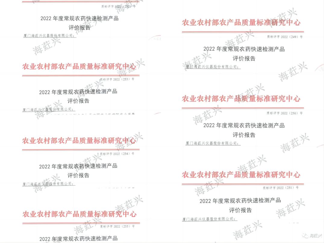 海荭兴参与评价的百菌清残留检测试纸条、苯醚甲环唑残留检测试纸条、吡虫啉残留检测试纸条、多菌灵残留检测试纸条等多种产品全部通过评价。