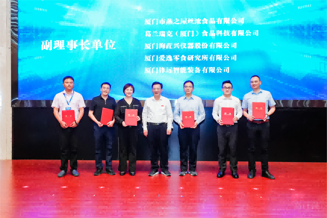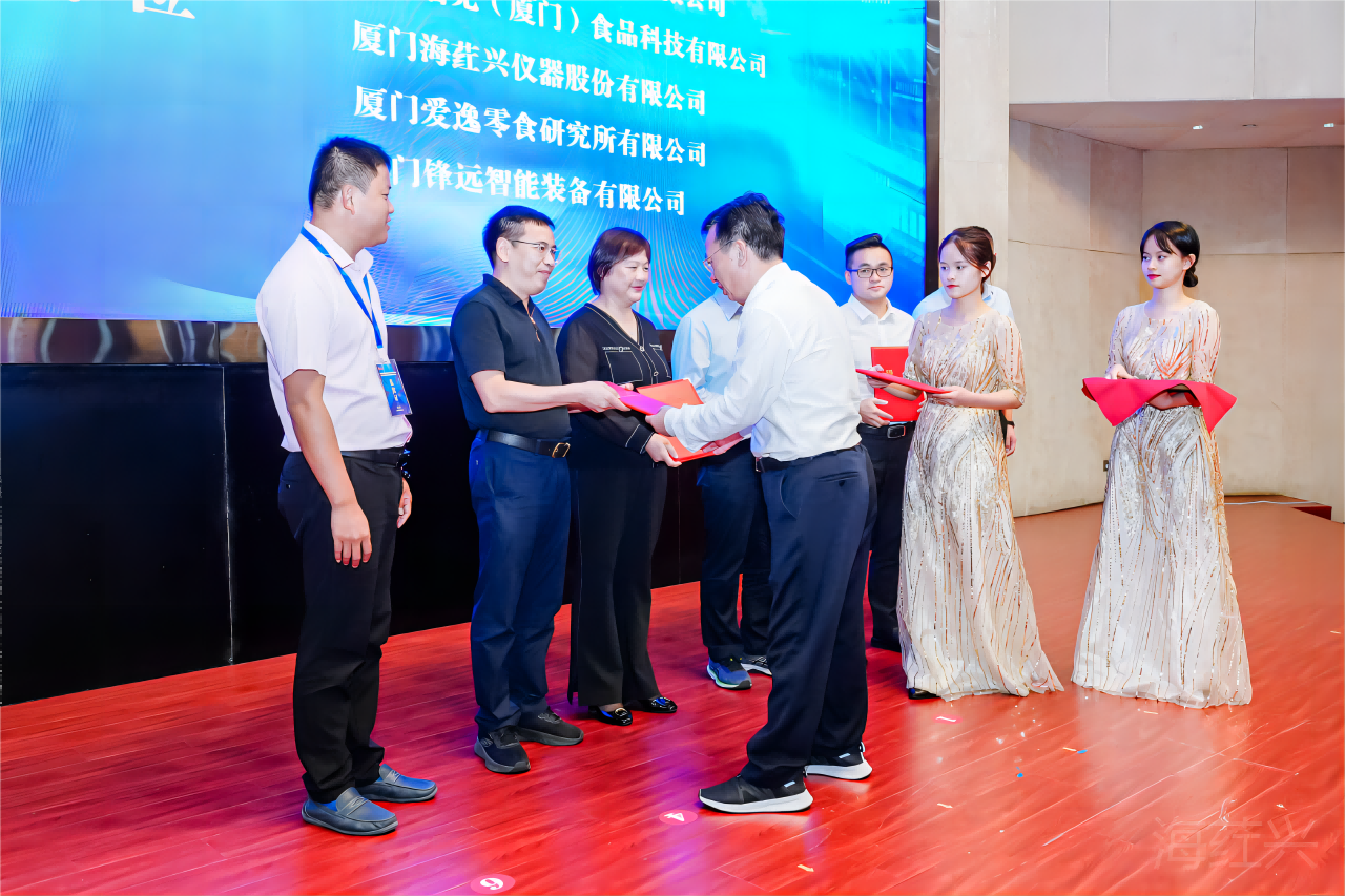 海峡食品产业技术创新联盟成立仪式上,厦门市科技局副局长范者胜、集美大学校党委书记沈灿煌等领导为联盟第一届理事长、副理事长、常务理事、理事、秘书长和副秘书长等颁发了证书,并聘任了一批食品产业教授与卓越工程师导师。厦门海荭兴仪器股份有限公司受聘为“首届海峡食品产业技术创新联盟副理事单位”,公司总经理张荣宝先生受聘为“产业教授”。
