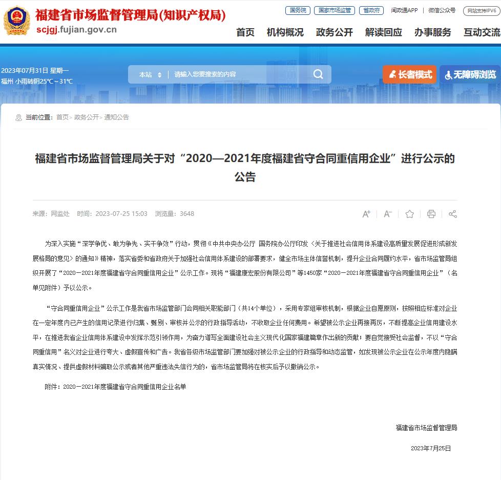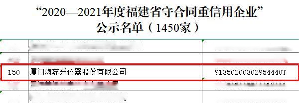 人无信不立,业无信不兴。近日,福建省市场监督管理局(知识产权局)发布“2020—2021年度福建省守合同重信用企业”公示,海荭兴凭借良好的企业信誉和合同履约能力榜上有名,获得“2020—2021年度福建省守合同重信用企业”荣誉。