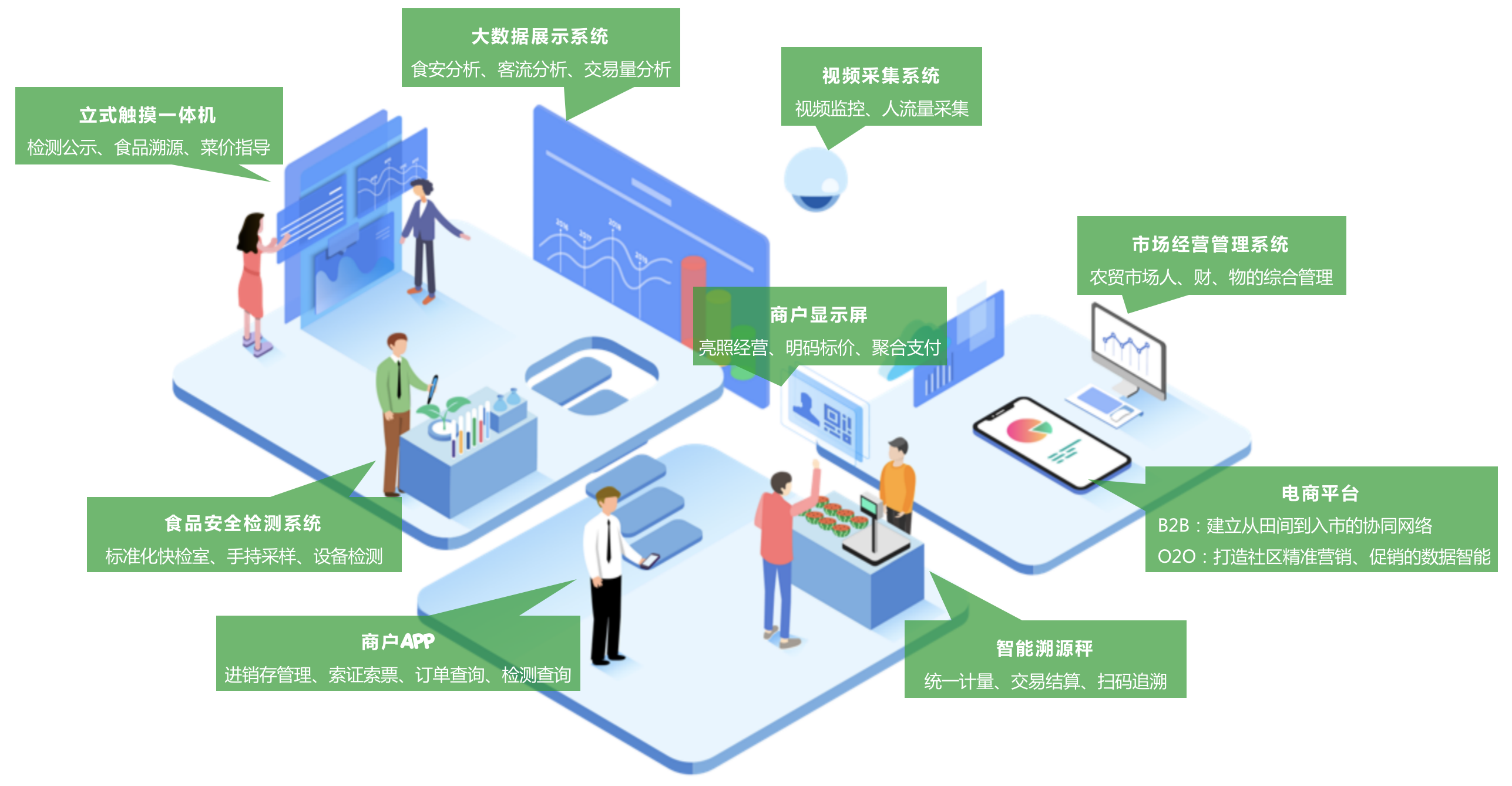 我公司建设“智慧农贸”平台,内置交易结算、产品追溯、食品检测、经营管理、电子商务五大板块,从软件和硬件两方面推动农贸市场数字化转型,构建“智慧新农贸”。在保留农贸市场“社交型消费场所”这个天然吸引力的同时,提高市场经营管理水平,增加商户收益,保障食品安全,优化消费体验。